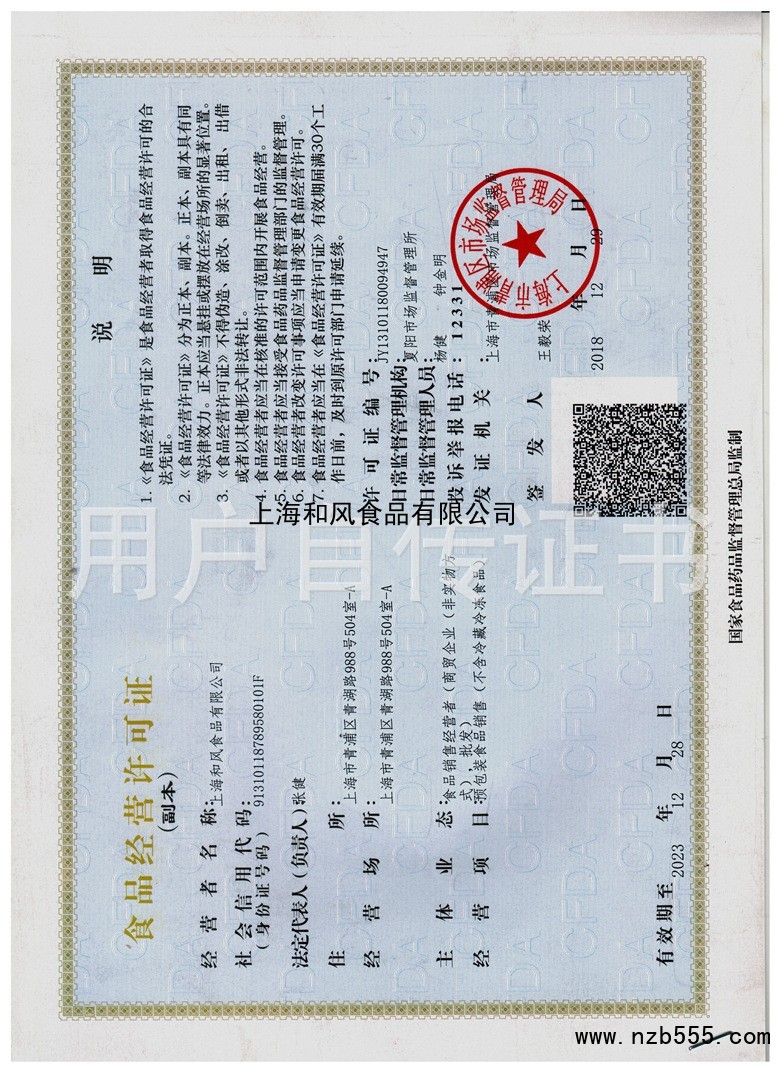 榮譽(yù)資質(zhì) 上海和風(fēng)食品有限公司
