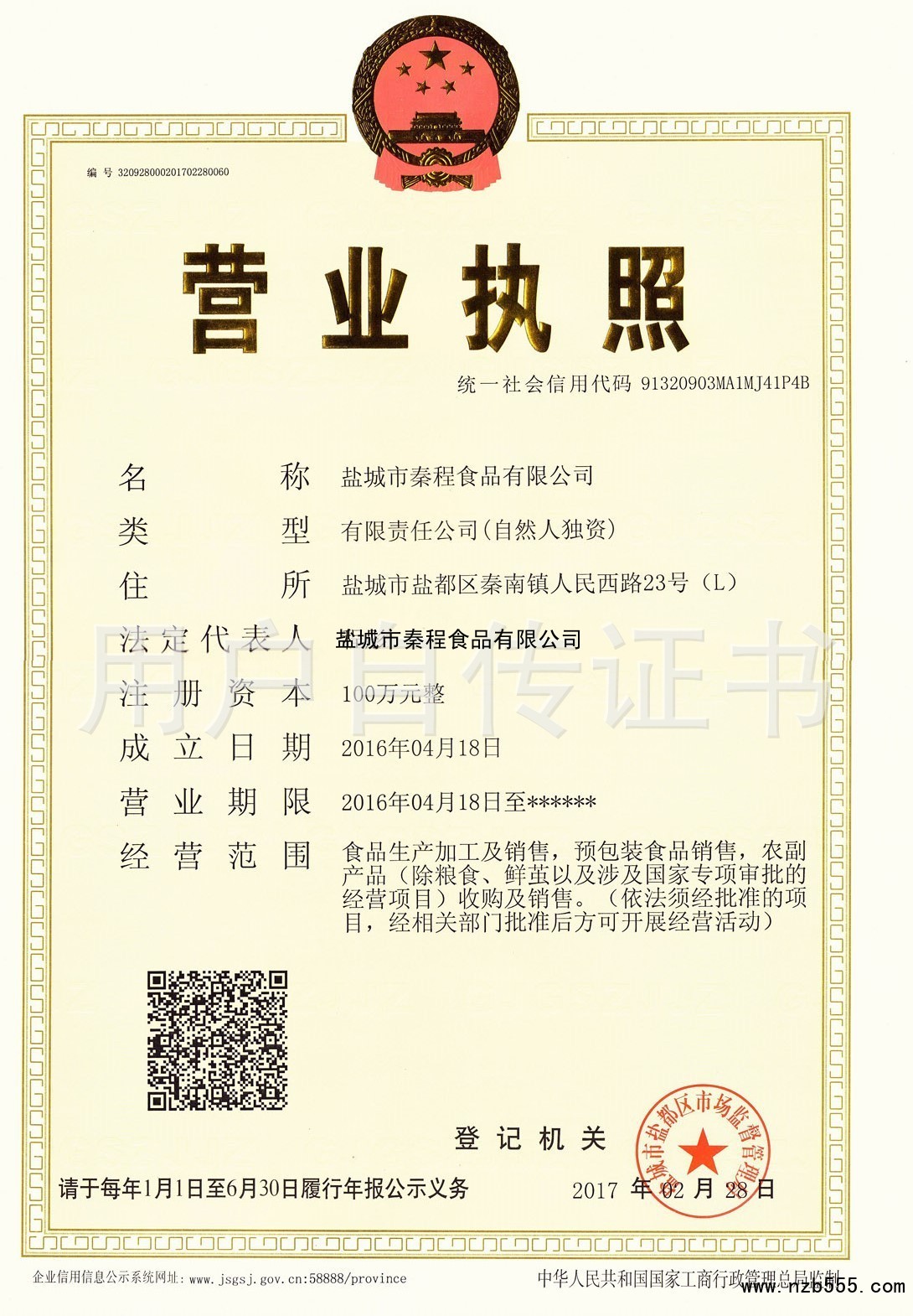 首頁(yè) > 榮譽(yù)資質(zhì) > 鹽城市秦程食品有限公司