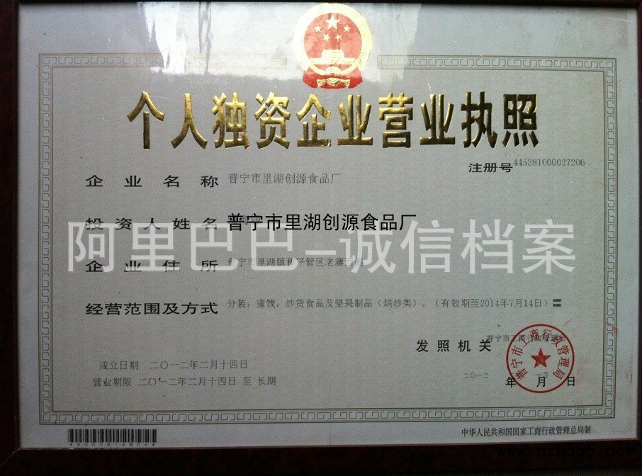 榮譽(yù)資質(zhì) 普寧市里湖創(chuàng)源食品廠