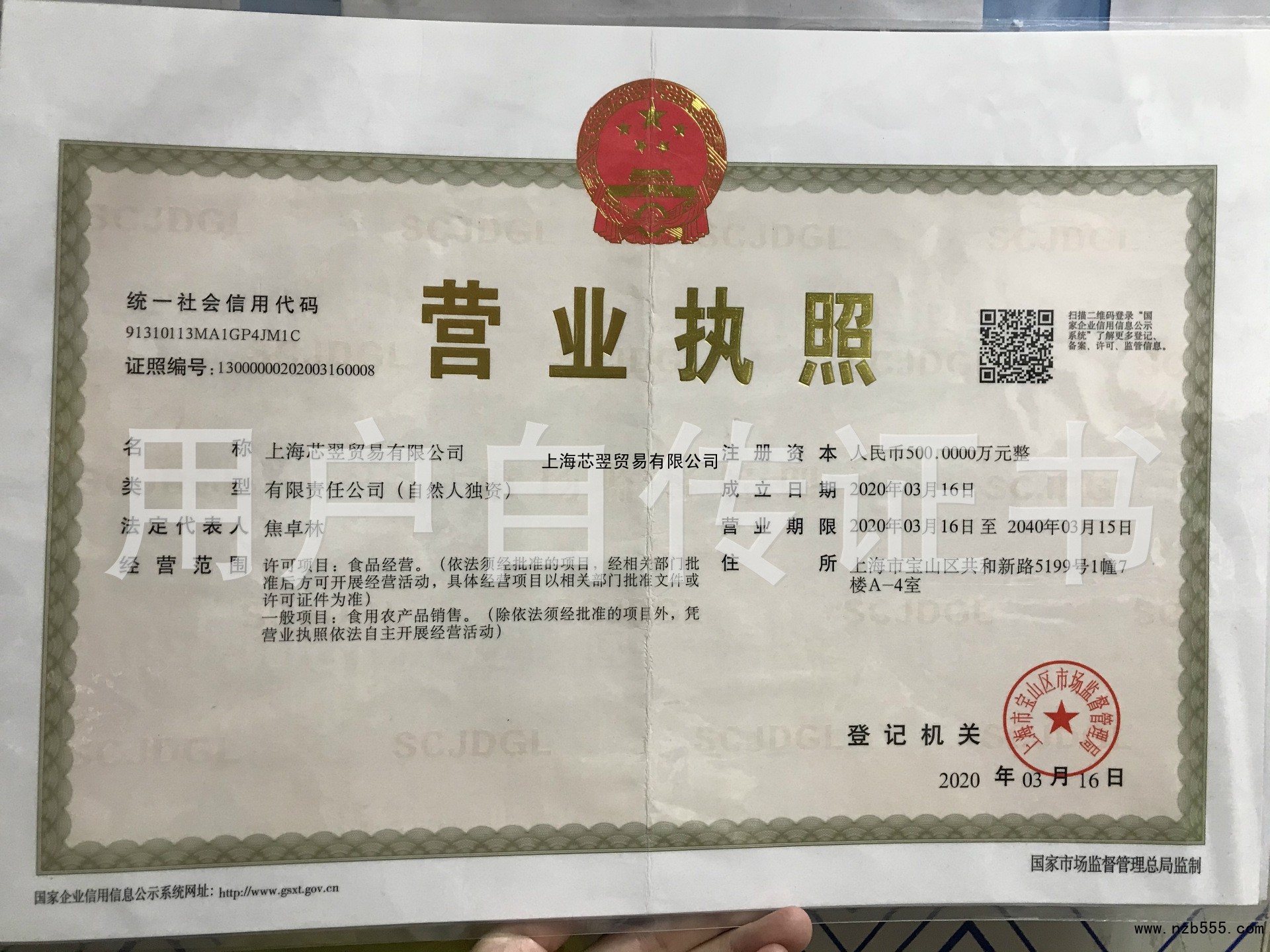 | 發(fā)證機(jī)構(gòu): | 上海市寶山區(qū)市場監(jiān)督管理局 | 發(fā)證時(shí)間 : | 2020-03-16 |
