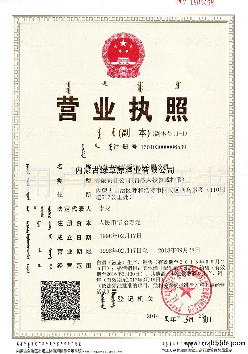 | 發(fā)證機(jī)構(gòu): | 呼和浩特市工商行政管理局回民區(qū)分局 | 發(fā)證時(shí)間 : | 2014-04-22 |