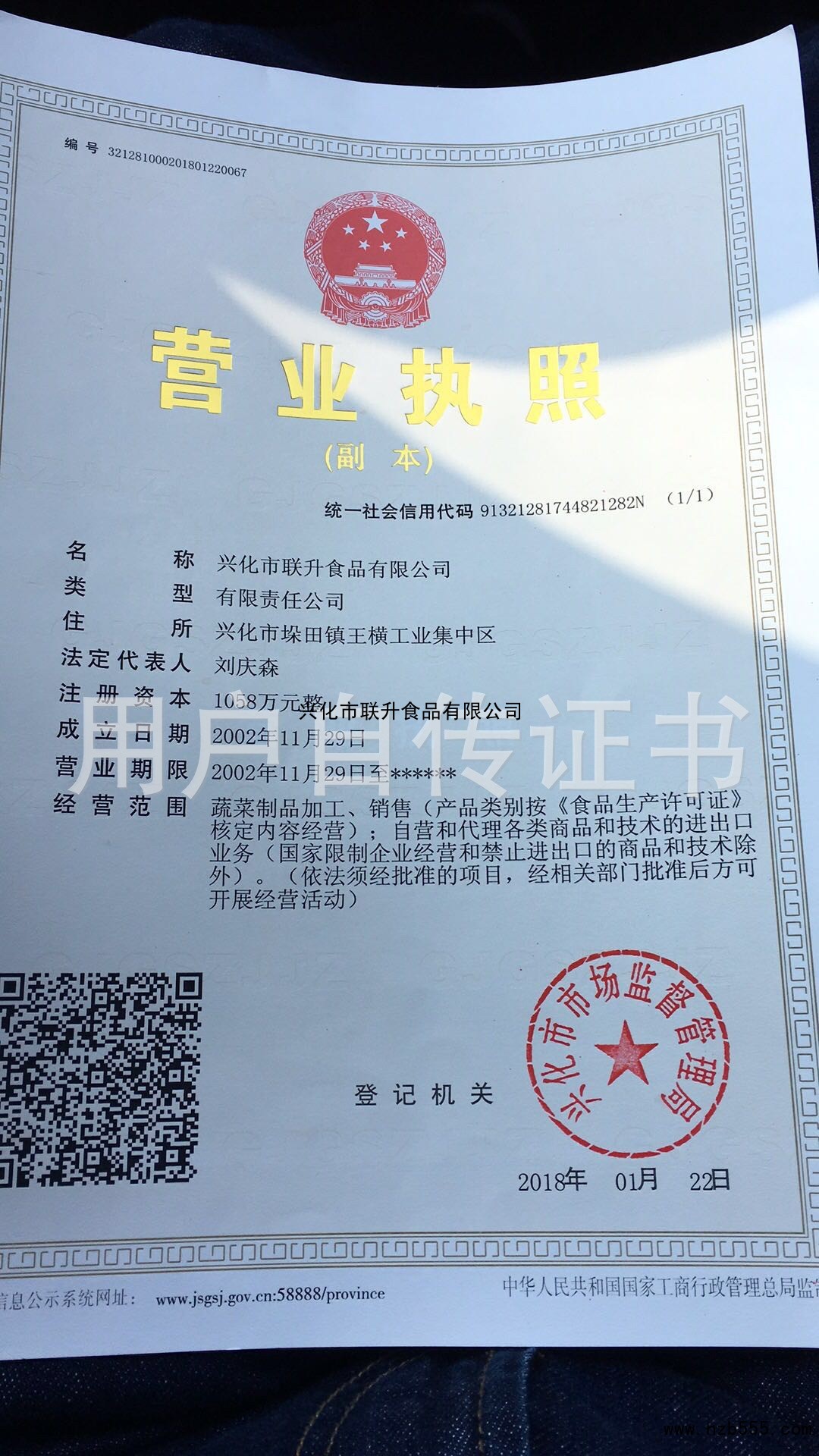 | 發(fā)證機(jī)構(gòu): | 興化市市場監(jiān)督管理局 | 發(fā)證時間 : | 2018-01-22 |