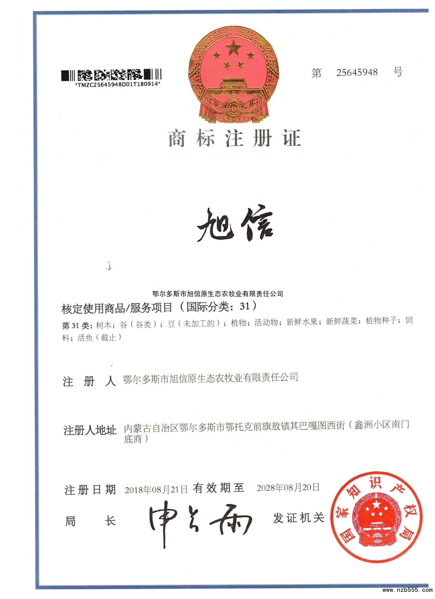 首頁 > 榮譽(yù)資質(zhì) > 商標(biāo)注冊證 旭信 第31類