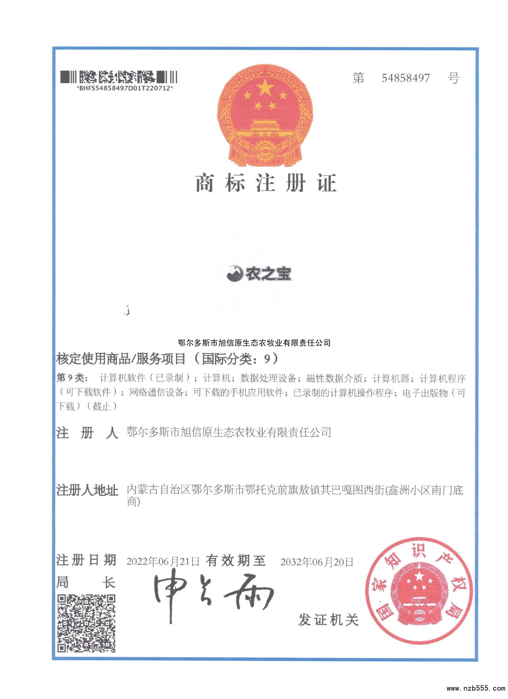 首頁 > 榮譽(yù)資質(zhì) > 商標(biāo)注冊證 農(nóng)之寶 第9類