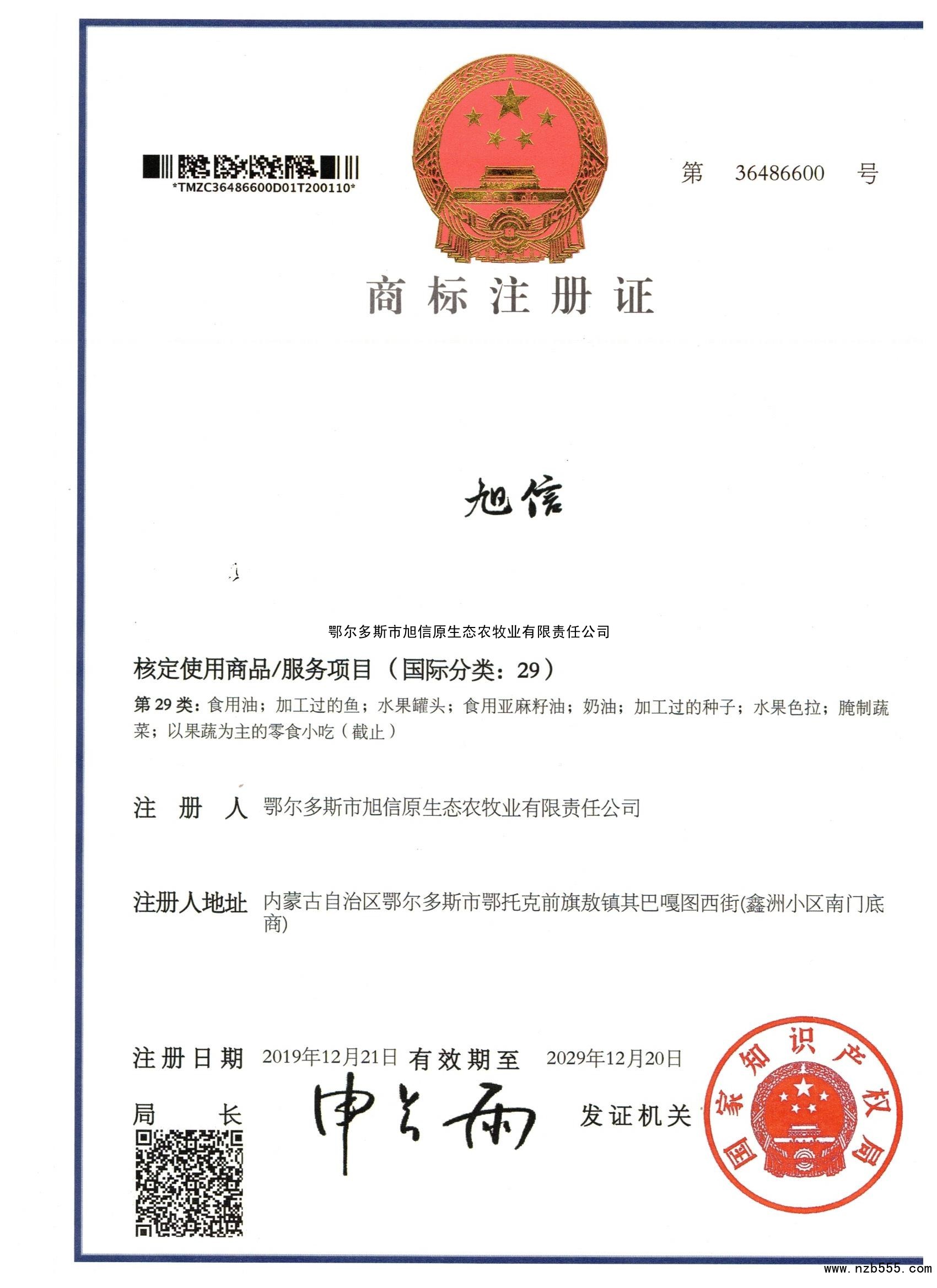 榮譽(yù)資質(zhì) 商標(biāo)注冊(cè)證 旭信 第二十九類