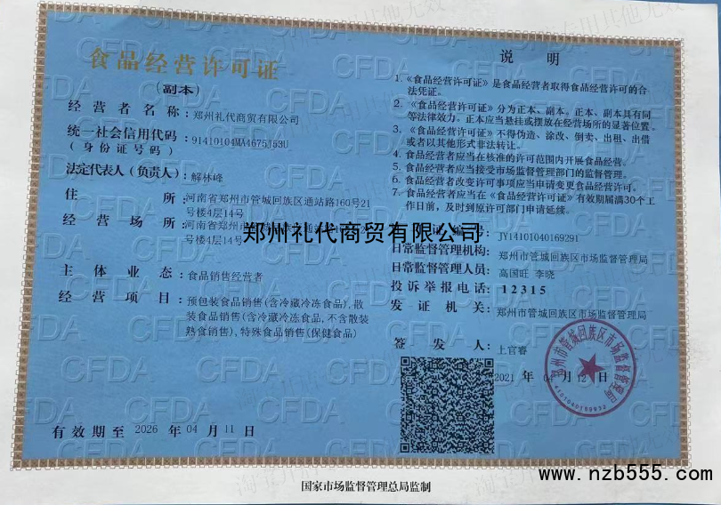 | 發(fā)證機(jī)構(gòu): | 鄭州市管城回族區(qū)市場(chǎng)監(jiān)督管理局 | 發(fā)證時(shí)間 : | 2021-04-12 |