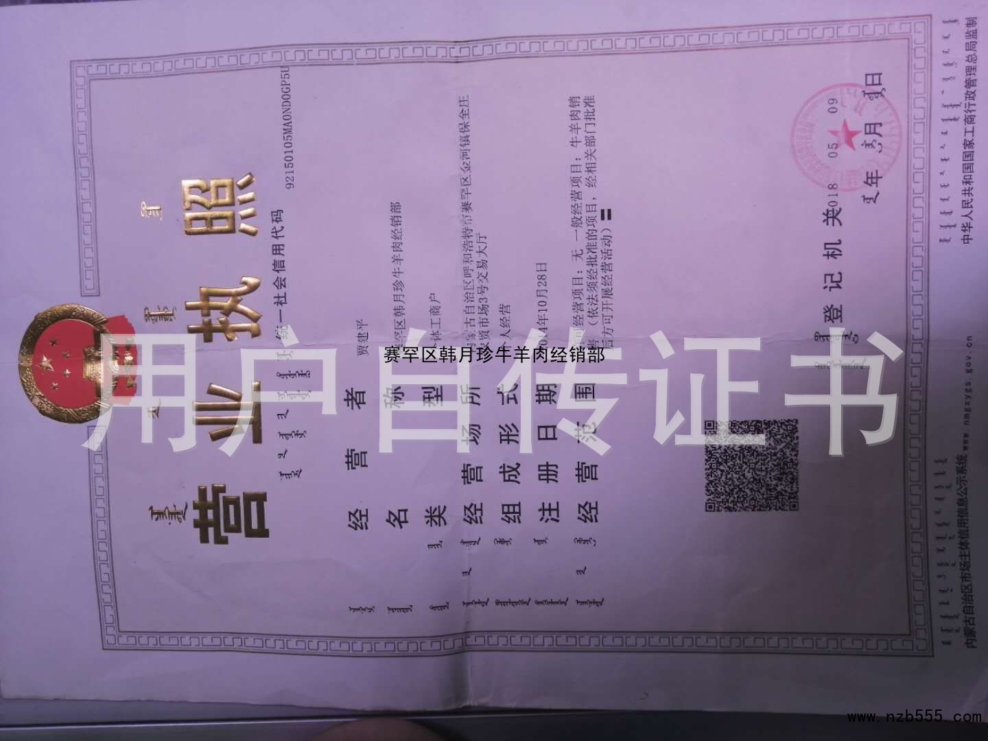 榮譽(yù)資質(zhì) 賽罕區(qū)韓月珍牛羊肉經(jīng)銷部