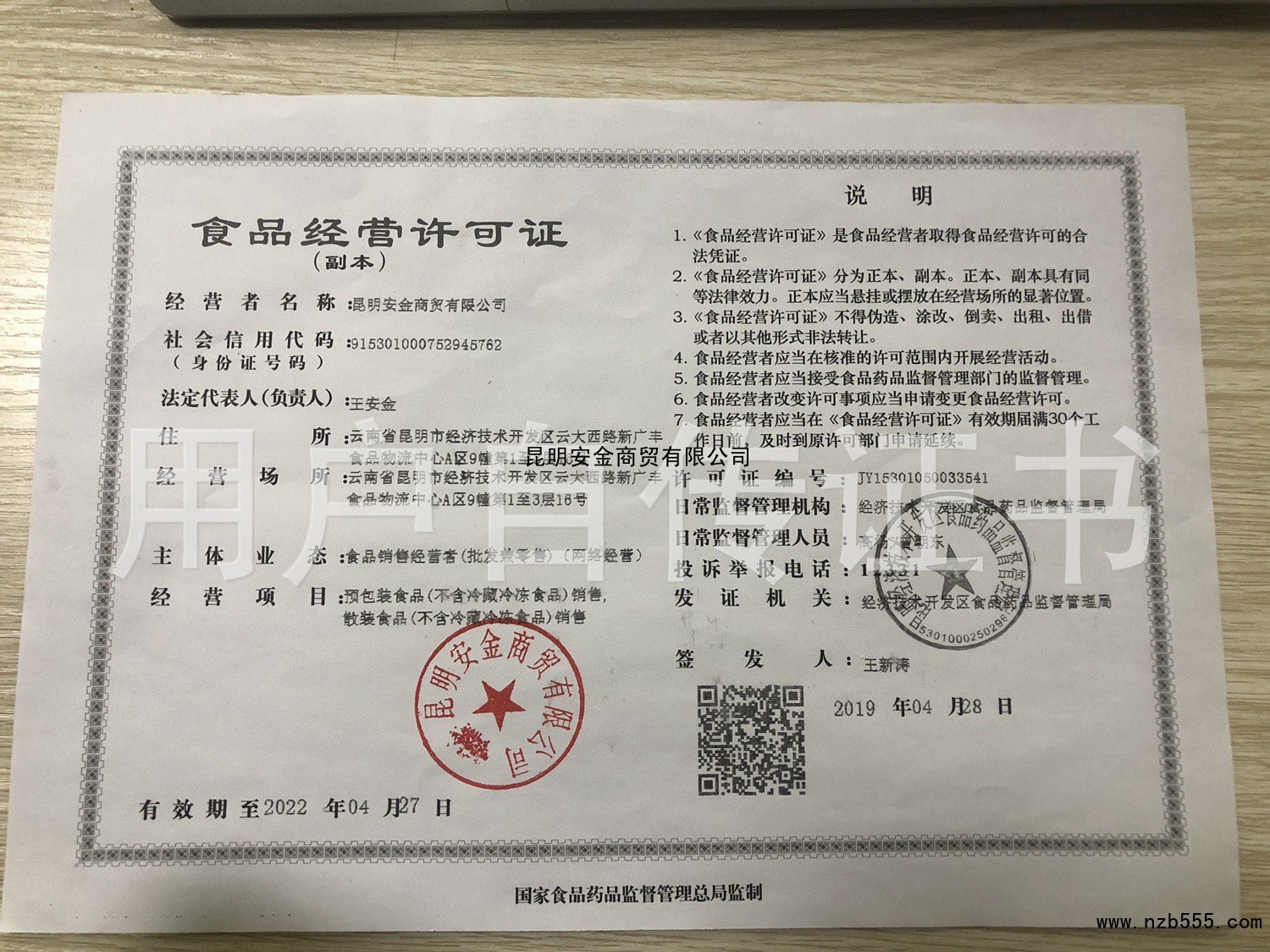 | 發(fā)證機(jī)構(gòu): | 昆明經(jīng)濟(jì)技術(shù)開發(fā)區(qū)食品藥品監(jiān)督管理局 | 發(fā)證時間 : | 2019-04-28 |