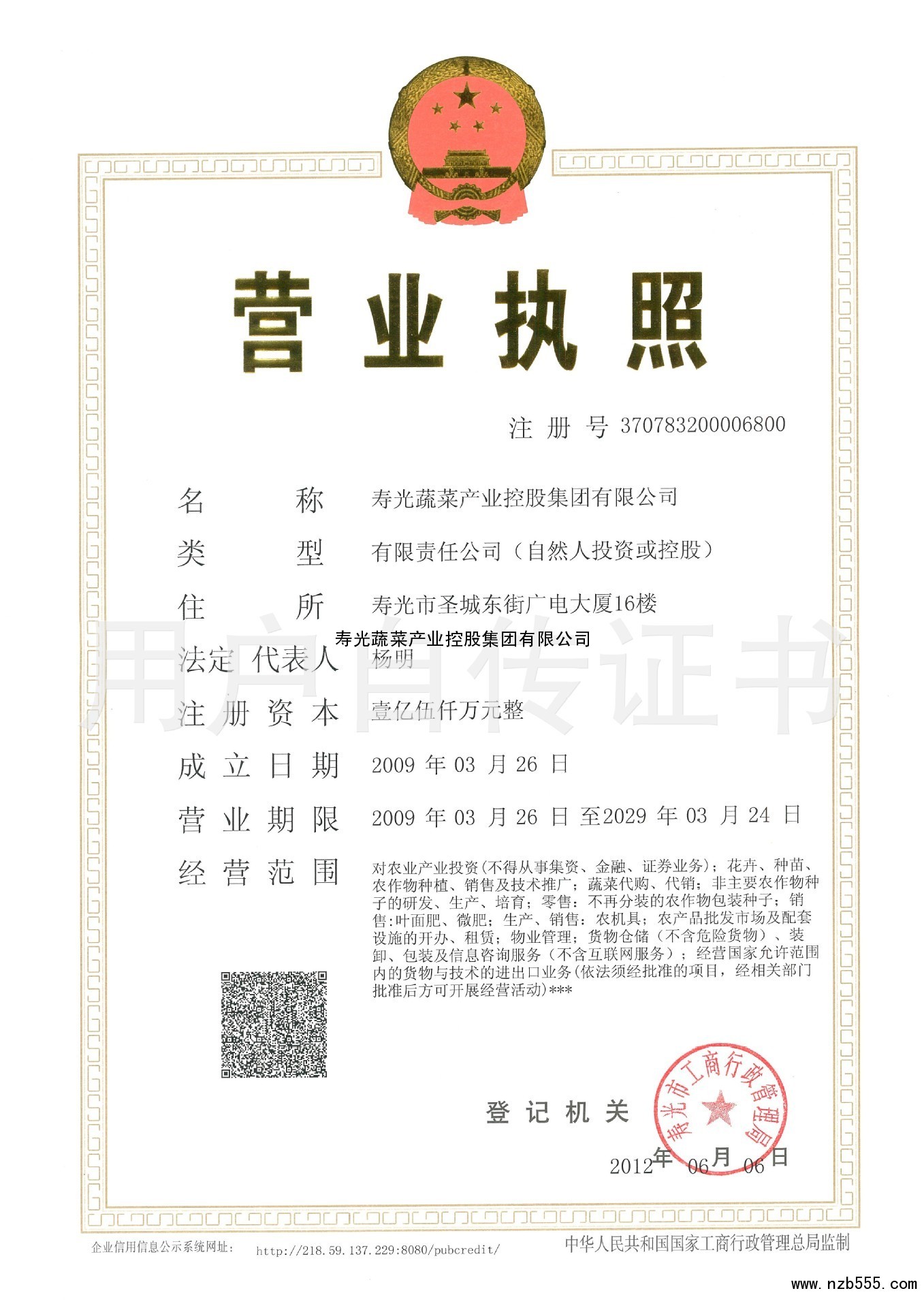 | 發(fā)證機(jī)構(gòu): | 壽光市工商行政管理局 | 發(fā)證時(shí)間 : | 2012-06-06 |