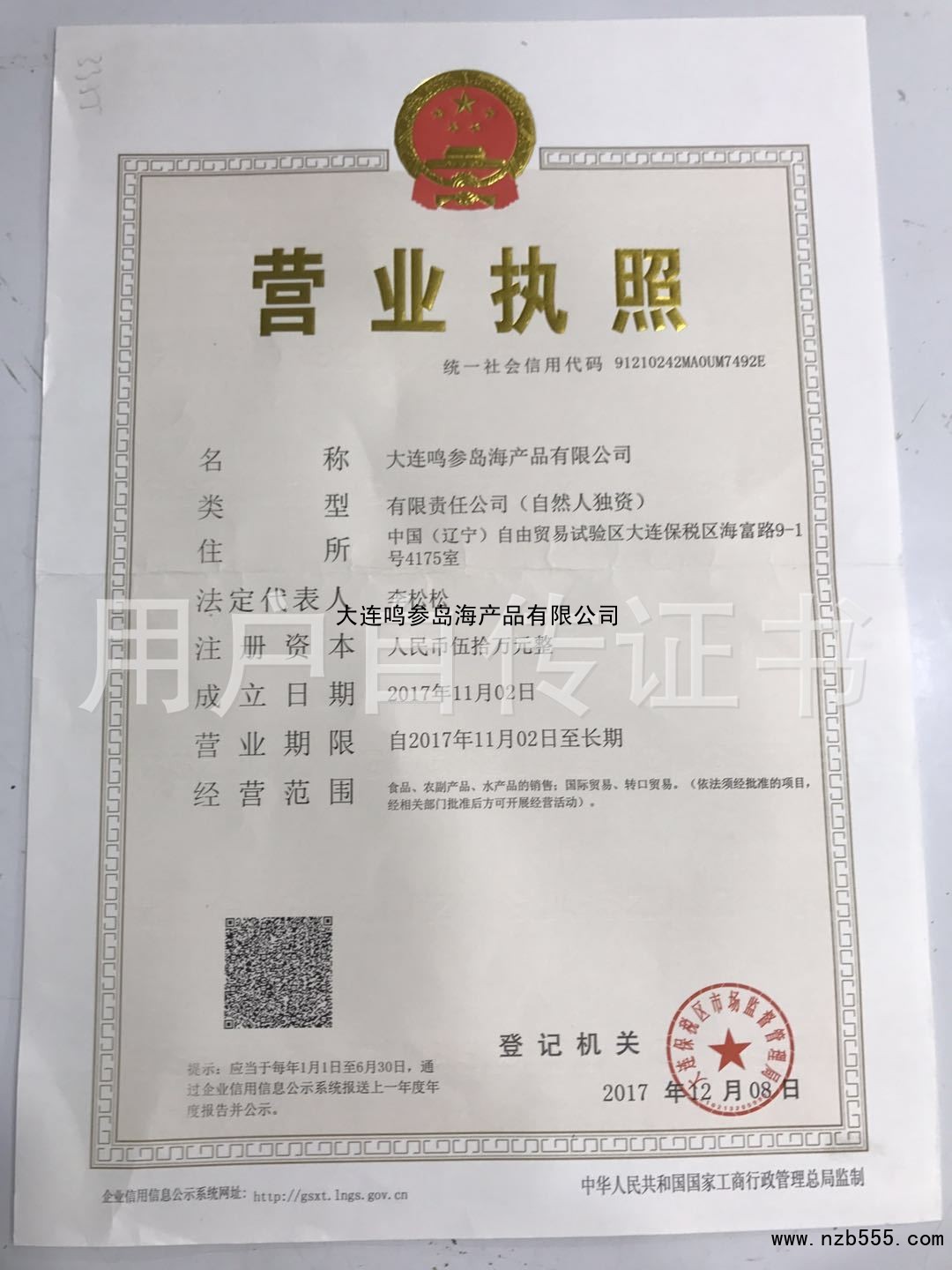 | 發(fā)證機(jī)構(gòu): | 大連保稅區(qū)市場(chǎng)監(jiān)督管理局 | 發(fā)證時(shí)間 : | 2017-12-18 |