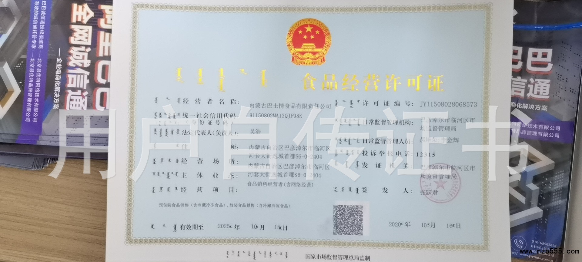 | 發(fā)證機(jī)構(gòu): | 巴彥淖爾市臨河區(qū)市場(chǎng)監(jiān)督管理局 | 發(fā)證時(shí)間 : | 2020-10-16 |