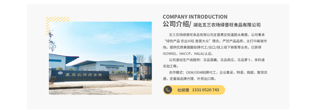 品牌介紹:湖北五三農(nóng)場綠普旺食品有限公司于2017年11月10日成立,公司經(jīng)營范圍包括:食品、預包裝食品、健康食品、蔬菜制品、水果制品、茶葉制品、植物提取物、發(fā)酵產(chǎn)品的生產(chǎn)、加工、銷售;農(nóng)產(chǎn)品加工技術(shù)研發(fā)、技術(shù)轉(zhuǎn)讓,倉儲服務等。是果蔬脆片、果蔬脆片等產(chǎn)品專業(yè)生產(chǎn)加工的公司,擁有完整、科學的質(zhì)量管理體系。湖北五三農(nóng)場綠普旺食品有限公司的誠信、實力和產(chǎn)品質(zhì)量獲得業(yè)界的認可。 [詳細介紹]