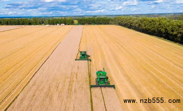 聯合收割機在北大荒集團紅星農場有限公司田間收獲小麥。