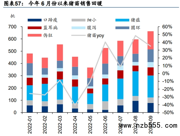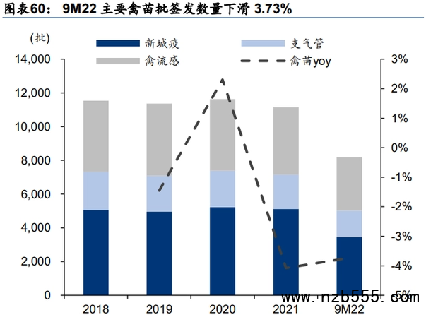 豬苗:今年上半年受限于生豬價格的低迷,養殖戶用苗積極性欠佳。根據國家獸藥數據庫, 整個上半年口蹄疫、豬細小、豬瘟、藍耳病、腹瀉、圓環等主要豬用疫苗批簽發數量均出 現下降,上半年批簽發總數量同比-17%。進入下半年,隨著豬價大幅上漲,養殖戶盈利轉 好,相應帶動了用苗積極性與補欄意愿,因此豬苗銷售邊際回暖。整體看,9M22 主要豬苗 批簽發數量同比增速為-3.67%,22Q3 主要豬苗批簽發數量同比增長 29%。 禽苗:今年禽養殖整體盈利情況不佳,養殖戶補欄積極性差,拖累禽苗銷售增速。據國家 獸藥數據庫,9M22 新城疫、支氣管、禽流感批簽發數量分別為 3452、1560、3162,同比 分別為-11.40%、3.11%、2.60%。整體看,9M22 主要禽苗批簽發數量下滑 3.73%。