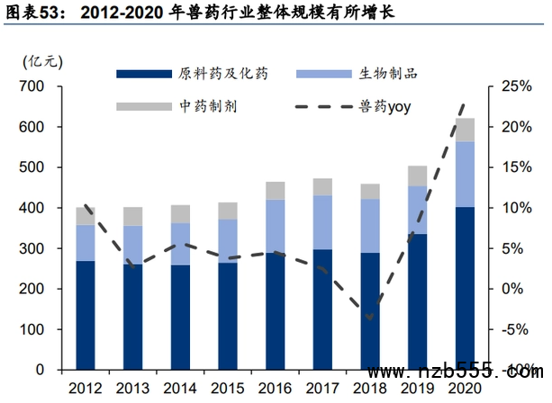 從整個獸藥行業(包括原料藥化藥、生物制品即疫苗、中藥制劑)來看,2012-2020 年我 國獸藥行業銷售規模從 401 億元增長到 621 億元,CAGR 為 5.6%。其中,2020 年原料藥 及化藥銷售規模 401.78 億元,占 65%,生物制品 162.36 億元,占比 26%,中藥制劑 56.81 億元,占比 9%。