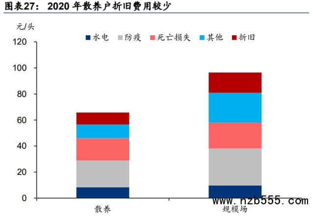 散戶成本高,更容易被出清。歷史上,由于散戶資金量較小,抗風險能力較弱,而成本又 較高,因此規模化進程一直持續,且歷次產能出清大部分情況下均以散戶產能退出。根據 Wind,2020 年規模場養殖成本相比散養戶有優勢,散戶成本為 2913.65 元/頭,規模戶為 2699.42 元/頭。分拆成本看,規模場物質及服務費用相比散戶更高,土地費用基本持平, 降成本顯著的是人工費用,體現了集約化的特點。散戶由于缺少規模效應,頭均人工費用 占比較大,比規模戶高 350 元/頭。