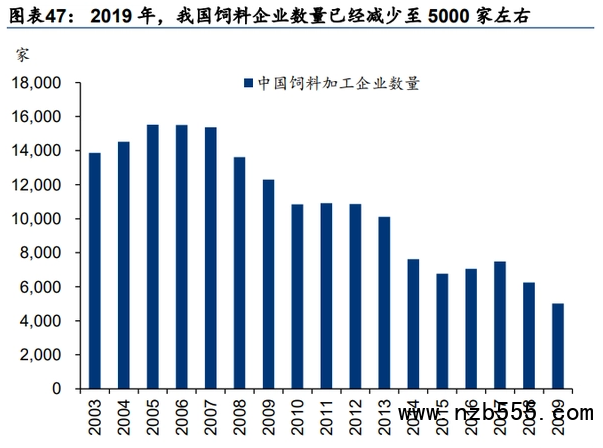 整合縱深推進,飼料行業集中度呈上升趨勢。據中國飼料工業協會數據,2021 年全國 10 萬噸以上規模飼料生產廠 957 家,比上年增加 208 家;合計飼料產量 17707.7 萬噸,比上 年增長 24.4%,在全國飼料總產量中的占比為 60.3%,比上年提高 7.5 個百分點。21 年全 國有 14 家生產廠年產量超過 50 萬噸,比上年增加 5 家。年產百萬噸以上規模飼料企業集 團 39 家,比上年增加 6 家;合計飼料產量占全國飼料總產量的 59.7%,比上年提高 5.1 個 百分點;其中有 6 家企業集團年產量超過 1000 萬噸,比上年增加 3 家。 企業數量逐步減少。2006 年以來,我國飼料企業數量整體呈下降趨勢,行業集中度逐步提 升。根據飼料工業協會統計,2019 年我國飼料企業數量 5016 家,相較歷史最多的 2005 年 15518 家已經減少了超過 2/3。