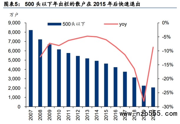 散戶數量一直在減少。根據中國畜牧獸醫年鑒,自世紀初到現在,500 頭以下年出欄的小 型散戶數量一直在減少,2000 年左右高達 1 億戶以上,而經過接近 20 年的去化與整合, 2020 年 500 頭以下年出欄的小型散戶數量僅有 2062 萬戶,數量減少了超過 80%。而由于 環保等因素,自 2015 年以來生豬養殖逐步進入集約化,5000 頭以上年出欄的養殖戶數量 也在減少。