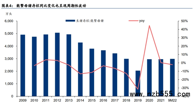 22 年 9 月份能繁為 4362 萬頭。根據國家統計局數據,到 2022 年 9 月,全國能繁母豬存欄 量 4362 萬頭。前三季度,全國生豬出欄 52030 萬頭,比上年同期 49193 萬頭,增長了 5.8%。 分季度看,一季度生豬出欄同比增長 14.1%,二季度增長 2.5%,三季度持平略減。受生豬出 欄增加帶動,豬肉產量也持續增加,前三季度全國豬肉產量 4150 萬噸,同比增長 5.9%。隨 著前期產能釋放,生豬生產增速放緩,市場價格持續反彈,養殖預期看好,養殖戶積極補欄, 生豬存欄環比增加。三季度末,全國生豬存欄 44394 萬頭,同比增長 1.4%,環比增長 3.1%, 連續兩個季度環比增長;其中,能繁殖母豬存欄 4362 萬頭,處于合理區間。