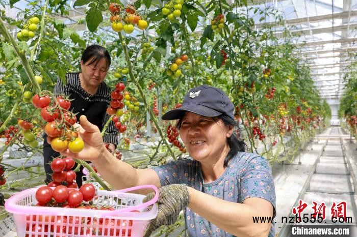 圖為土默特左旗國家現(xiàn)代農(nóng)業(yè)示范園區(qū)智慧溫室里,工作人員正在采摘“佳西娜”番茄。
