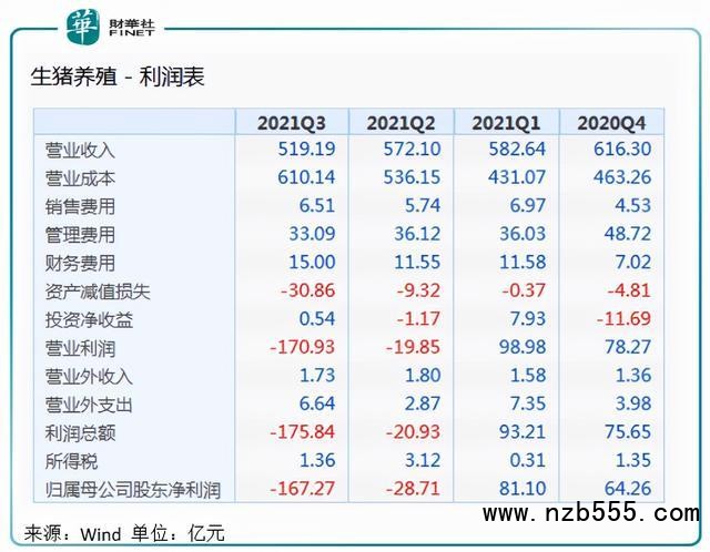 今年前三個季度,Wind生豬養殖細分板塊27家上市公司營收規模逐季下降,從一季度的582.64億元,下降到第三季度的519.19億元;歸母凈利潤從一季度盈利81.10億元,到第二季度虧損28.71億元,到第三季度更是虧損達167.27億元。