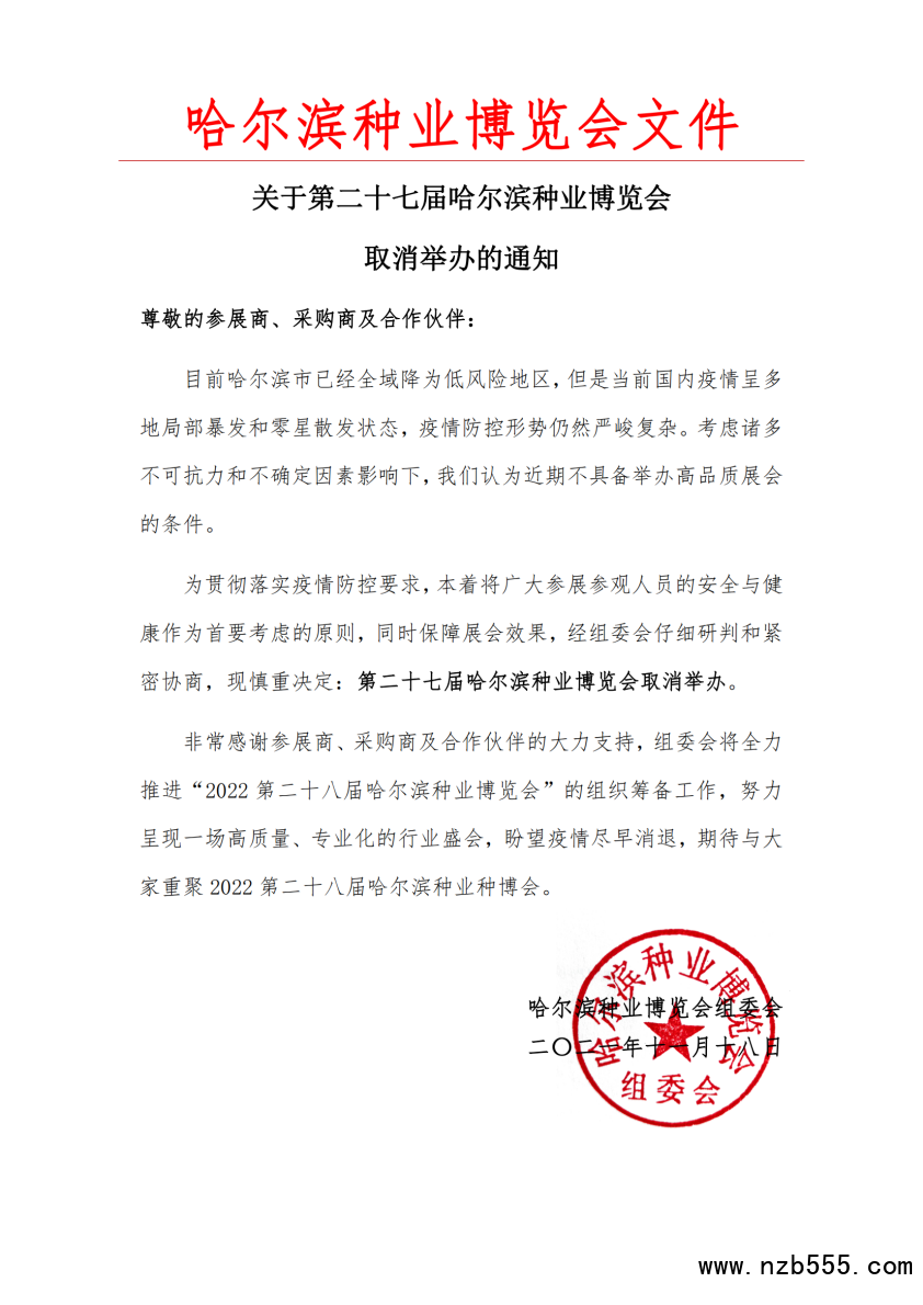 11月18日,從哈爾濱種業(yè)博覽會(huì)組委會(huì)獲悉,為保障展會(huì)效果,同時(shí)將廣大參展參觀人員的安全與健康作為首要考慮的原則,經(jīng)組委會(huì)仔細(xì)研判和緊密協(xié)商,現(xiàn)慎重決定:第二十七屆哈爾濱種業(yè)博覽會(huì)取消舉辦。
