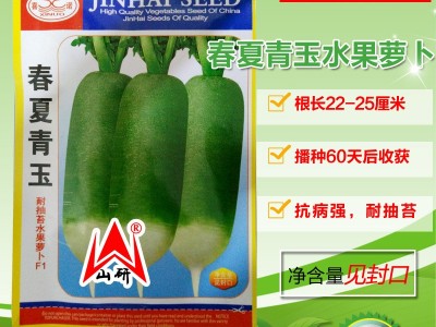 利用韓國(guó)材料雜交選育的春、夏季種植的水果型青蘿卜品種,播種后60天收獲,植株生長(zhǎng)健壯,綜合抗病性強(qiáng),耐抽苔,耐熱性強(qiáng)。葉色深綠,羽花狀,肉質(zhì)根長(zhǎng)圓柱型,根長(zhǎng)22-25厘米,橫徑7厘米左右;外皮光滑,綠色有光澤,皮薄肉脆綠,汁多脆甜,生熟食用皆佳。及時(shí)收獲不易糠心,產(chǎn)量高,商品性優(yōu)。是春、夏、秋季栽培獲得較高經(jīng)濟(jì)效益的佳品種。